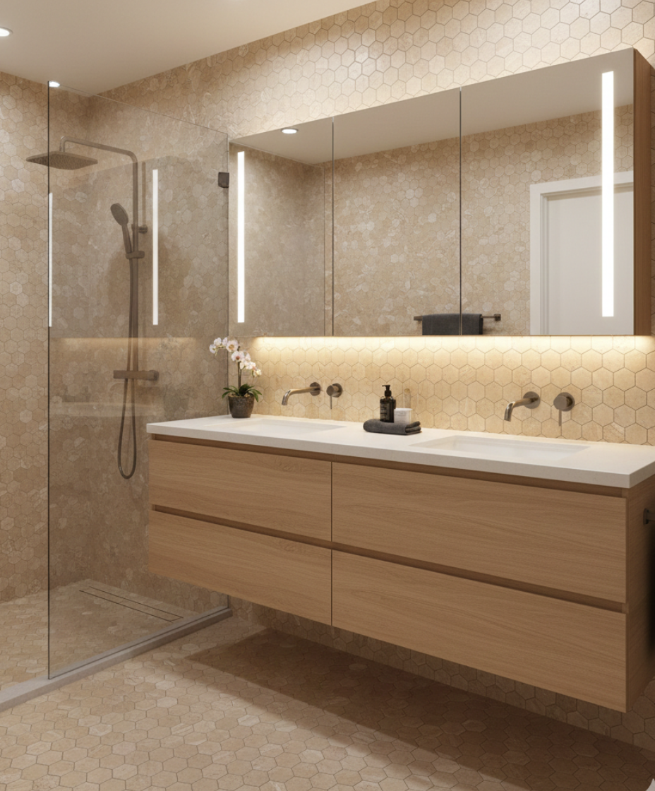 Duurzaam beige marmer met subtiele grijze aders – een moderne klassieker die niet mag ontbreken in een stijlvol interieur. De hexagonvorm zorgt voor een verfijnde, unieke uitstraling op zowel vloeren als wanden. In combinatie met onze Nexion-tegels ontstaat een harmonieus geheel. Het geheim zit in de juiste combinaties – en daar helpen we je graag bij.